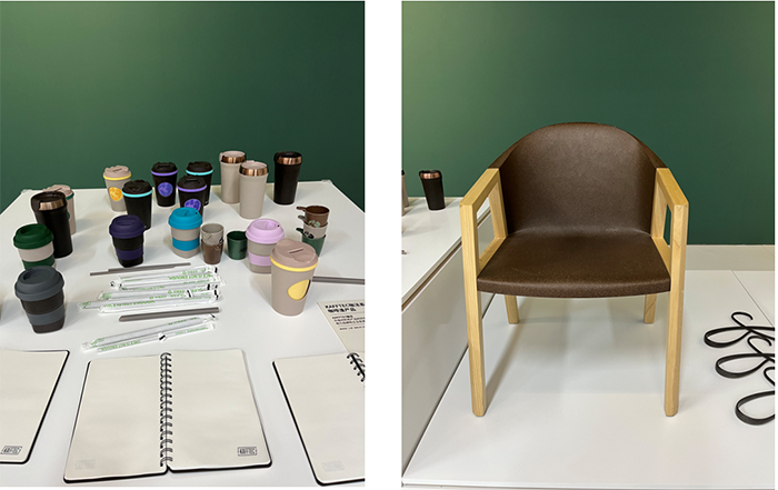 展覽現場,將廢棄的咖啡渣再利用與再設計,重新制造出新的產品