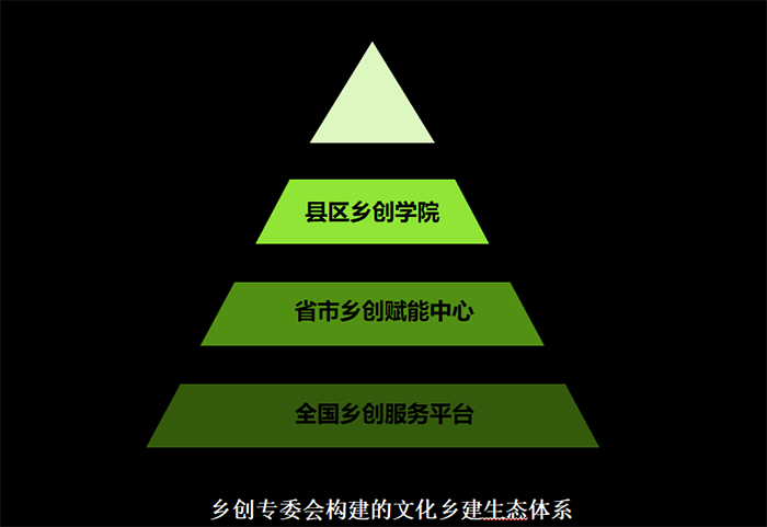 我們期望這個鄉創專委會可以構建一個文化鄉建賦能生態體系,吸引更多的鄉創機構一起來努力和助力。我們把這個鄉創生態體系分成三個層次:第一個是國家層次,即在文化和旅游部產業發展司的支持下,構建一個全國性鄉創服務平臺,提供資訊、信息、人才等方面的服務,提供鄉創賦能工具包,制定鄉創人才標準、鄉創營造工作指南。以這次美麗中國鄉建紀事展覽為契機,我們可以配合中國美院美麗中國研究院把這些香腸案例整理好、梳理好,提煉好,轉變成教材、方法論和工具,為更多的鄉建人士提供知識服務。第二個是省市層次,希望在有條件的省市里,在黨委宣傳部、政府文旅部門的支持下,建立省市鄉創賦能中心,開展相關的指導工作。最后一個是區縣層次,在條件成熟的區縣建設鄉創學院或鄉創營地,具體執行到相關的鄉創實務。