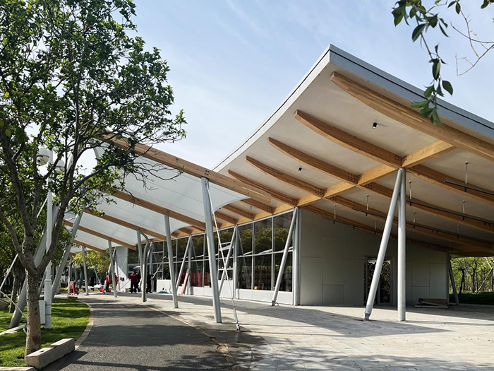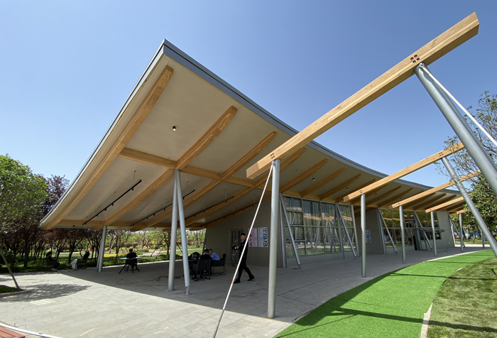 本次“邊飲茶,邊讀書”書展落地在剛剛建成的四季·秋書屋,四季·冬書屋,書屋外觀給人印象最深的就是高挑的“飛檐”以及適應百花園廣場的弧形空間,在烈日炎炎的午后,居民和游客可以在檐下乘涼休憩,門口齊平的地面也方便了殘障者進出。