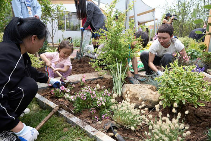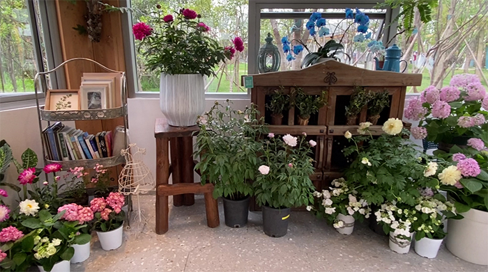 離書屋不遠,還有一座精致的“花亭空間”,室內室外都栽種著精致的花草。據策展人胡燕子介紹,“花亭”屬于文化季生態社區版塊,里面會產生一系列的公共活動,圍繞共建花園和生態美育兩個專題展開,之前花亭空地上的花草就是團隊與社區居民共同栽種,花草種類參考了清代信陽人吳其濬所作的《植物名實圖考》所列舉的信陽當地植物,這一細節也體現了主創人員對信陽在地歷史的深入挖掘與社區居民共建的呈現方式。4月28日,TBB邀約團隊四葉草堂和信陽本土團隊空谷造園以“生態之書--關于氣候和家園的社區共建”為題進行了社區花園居民營建工作坊。