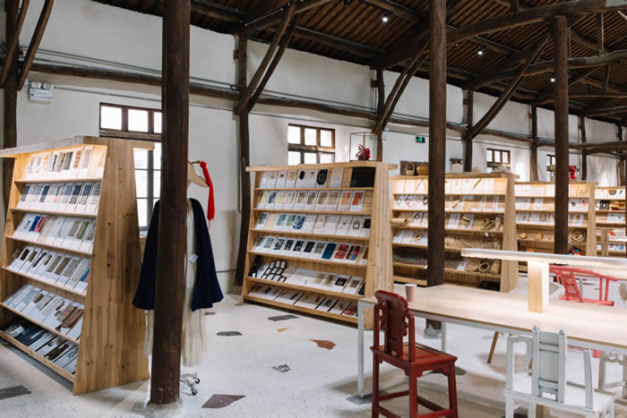 在主辦方的推薦下,筆者參觀了藝術季在地連接版塊的重要內容——“融設計圖書館”?!叭谠O計圖書館”在青山村中心位置,這座圖書館就是在村里一座老舊禮堂改建而成,相比青山村民居小洋樓,這座建筑很古舊,據說這里過去還跳過白毛女,辦過小工廠。進入圖書館首先最引人注目的就是空間的木結構,頭頂上老舊纖細、曲折交織的大小木梁看上去弱不禁風,就這樣歪歪扭扭地撐起偌大的屋子,而這座老屋的木架桌椅卻是楞角分明的現代設計,木架上呈現著中國傳統民藝的分類圖樣,比如繩結、編織,印染、雕版等等,每塊都是一種工藝的局部,每種工藝都有數種樣式。很難想象,在一個質樸的鄉村里能有傳統工藝收藏如此豐富細致的專業文化空間。