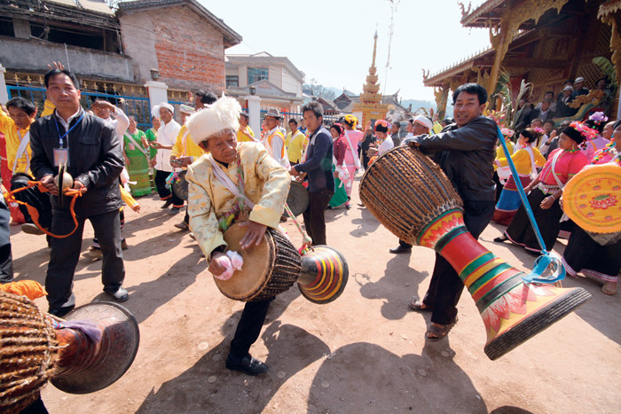 蘇老師帶領布朗寨的人在傣族人的寺院中跳起了象腳鼓舞,慶祝寺廟開光 喬曉光拍攝 2014年 圖片來源:《村莊里的藝術》