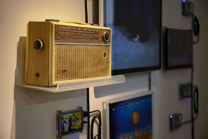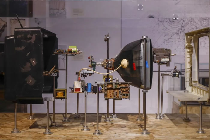 在藝術家的創作過程中,有四件代表社區歷史記憶與居民文化認同的物件被單獨提取出來。這其中包括了無線電一廠所生產的電視機,拆裝的電視展示著當時那個時代具有最先進最核心生產力的人們,而這些人也正是如今玉林的老居民。一臺早已被淘汰的老電視的拆裝也暗含著策展人的追問:當曾經那個時代先進的生產知識和經驗被時代無情的拋棄之后,我們該如何去安放它?