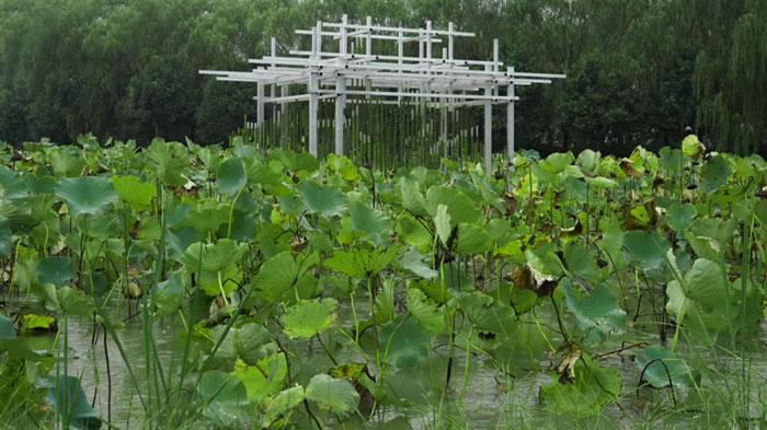 作品“蘭亭”,搭建在三洞橋村蓮花蕩入口不遠處的一片荷花池旁。這里有山有湖泊、有荷花池、有高標準農田,自然景色優美、農業特色資源豐富。