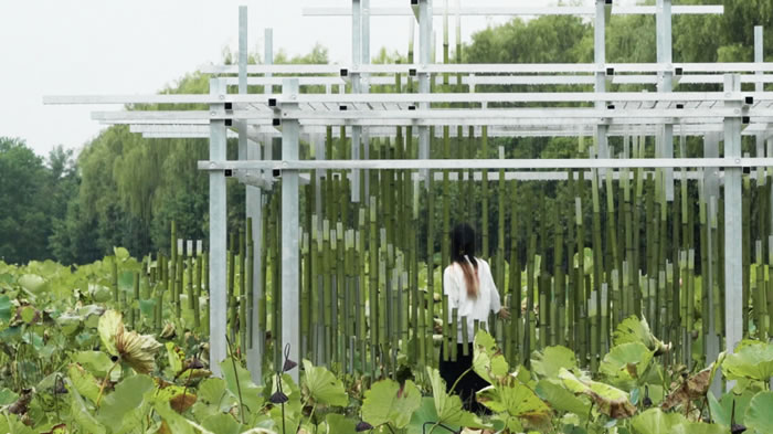 設計靈感源自水面漣漪,巧妙地將房屋、橋梁和碼頭連接在一起。用竹與線兩種材料進行彎曲與編織,以仿效自然的方式,既回應了當地的環境,又強調了可持續性和美感。在場地中自由穿梭,突破建筑的框架與水陸的邊界。一剛一柔,若隱若現,形成對比,引人駐足?!八@” 不僅是一件裝置藝術作品,更是對大坊橋這個歷史名村的一次深刻反思,提醒我們,鄉村傳統文化可以與現代藝術相結合,以新的方式煥發古村、古宅的生機。