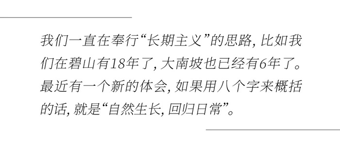 Z:應該是看到村民的笑臉,他們的認可和信任。接下來,碧山和大南坡我們想繼續陪伴下去。你會發現,我們一直在奉行“長期主義”的思路,比如我們在碧山有18年了,大南坡也已經有6年了。在經濟下行的今天,我們需要走出一條新路。最近有一個新的體會,如果用八個字來概括的話,我認為,有生命力的鄉村是一定是“自然生長,回歸日?!钡泥l村。我覺得碧山就是這樣的村子,雖然有點商業化的苗頭,也是在合理的范圍內。大南坡即便獲得了非常高的榮譽,但也有運營乏力等不利情況,這是我們最近需要調整的地方。