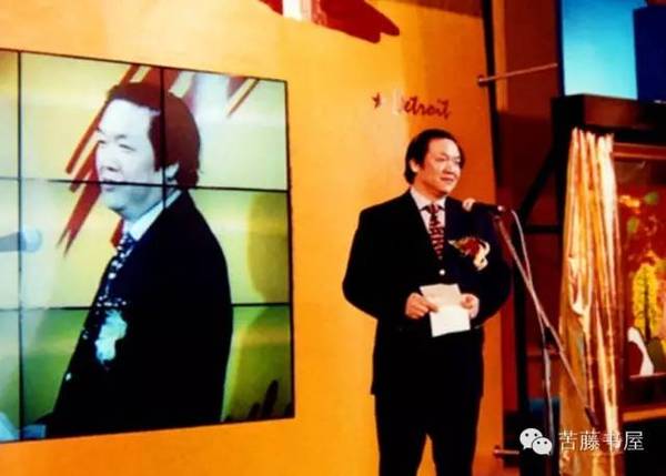 美國西北航空公司在上海舉辦“嘗試與對話——徐冬冬精品畫展”上,畫家發表感言并接受該公司的收藏證書(2000)
