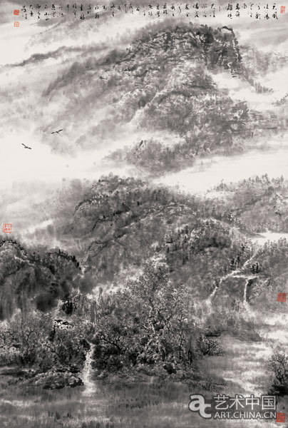 勞偉長期工作生活于云南,因此畫面里充滿了云的靈動和嶺的風骨。他的“大景花鳥”與他的云南高原山水表現出強烈的一致性,那就是得之于云南自然景觀寫生的強烈感受,布境多雄渾高曠、虛實相生,筆墨則氣厚思沉、蒼潤相濟,重寫而尚意;既強調用書法式的筆墨結構與筆墨律動,在狀物的同時縱情抒寫畫家的感情和個性,也重視在不忽略物象生意與審美特征的前提下,表達致廣大盡精微的精神意蘊。這正是勞偉的藝術個性,也是他的藝術創作更多地體現了傳統筆墨在現代視角的詮釋。