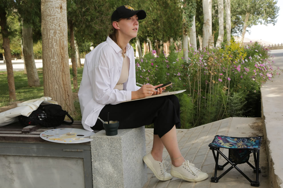 俄羅斯藝術家佩列佩利欽·安娜斯塔西婭在莫高窟宕泉河河岸邊寫生