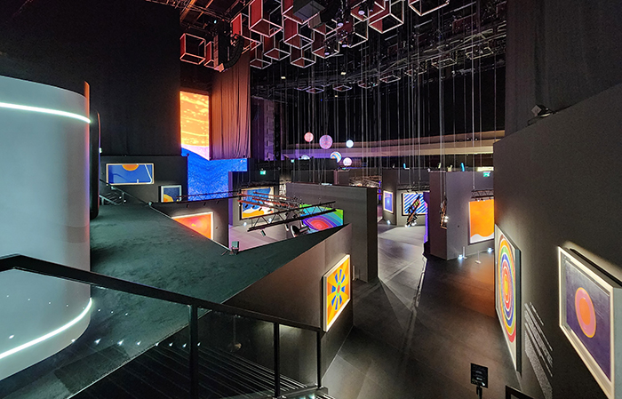 位于澳門美獅美高梅的美高梅劇院擁有全球室內最大的永久超高清LED顯示屏,面積達900平方米,相當于3個網球場面積,可以為觀眾呈現2800萬像素的觀賞體驗。數字化、沉浸式的“蕭勤的藝術宇宙”在這里成為現實。策展人用8個展區構成了蘊含“無限∞”的回行路線,打破了現場與虛擬的邊界,讓蕭勤作品中表達的中華傳統哲學觀和宇宙觀深入淺出地呈現在觀眾面前,也以“數字化”的方式完成了蕭勤的“太空探索”夢想。