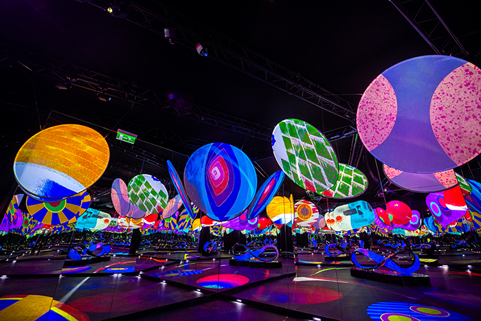觀眾站在特別為本次展覽制作的觀景臺上,如同面對浩瀚的宇宙。在蕭勤的藝術宇宙中,雖然光彩奪目、瞬息萬變,卻有著隱藏其中的運行規律。廣闊無垠的視角、恢弘的音樂與視覺,塑造了超乎想象的體驗。