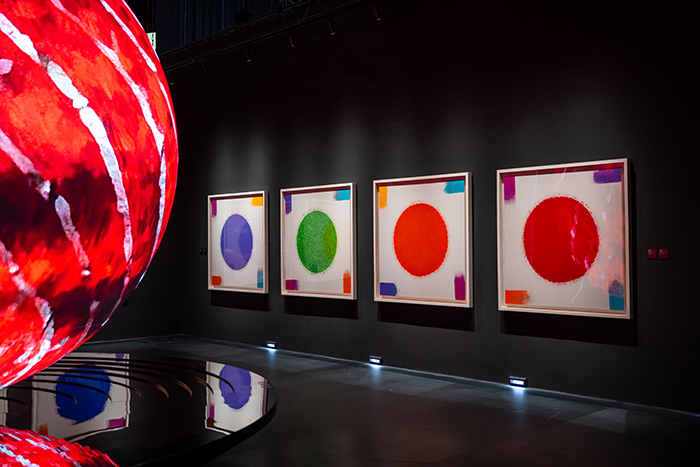 走進展廳,迎面而來是一個直徑3.5米的球形數字雕塑裝置,被稱為“生命之圓”,在其上方有7個投影星球相伴。圓,不僅是蕭勤作品中的重要符號,也是藝術家發起的“龐圖國際藝術運動”的象征標志。在裝置兩側分別是蕭勤1990年重返圓點符號創作的《新世界之能》系列和2000年之后由抽象圓點發展為具有具象主題宇宙景觀的作品。