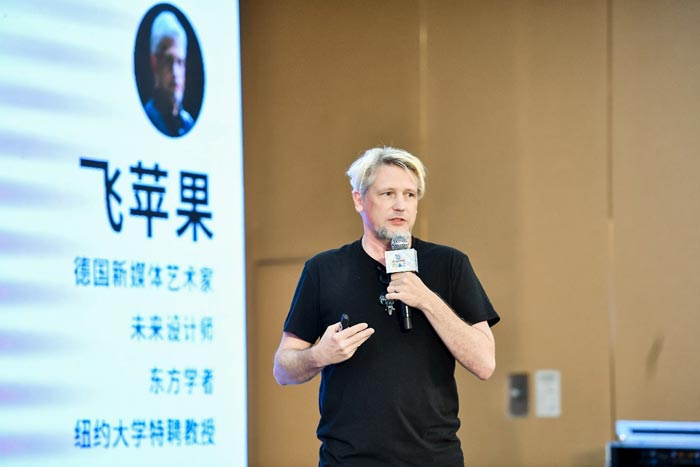 德國新媒體藝術家、上海天文館總設計師飛蘋果應邀出席,分享了AIGC軟件對其實際藝術創作中的應用及影響,并就AIGC藝術創作、沉浸式體驗教育、人工意識與超級智能等方面發表了創新性和前瞻性的觀點,探索設計在未來多學科融合創新過程中的價值。飛蘋果認為當AIGC智能創作時代來臨, “AI不會取代人類,不會使用AI的人才會最終被取代”。