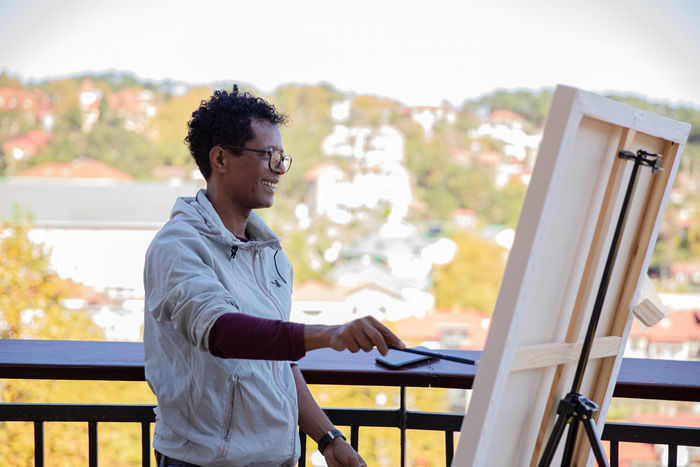厄立特里亞藝術家白很力(Berhane Tsegeyohannes Gebremichael)在牯嶺鎮廣場寫生創作
