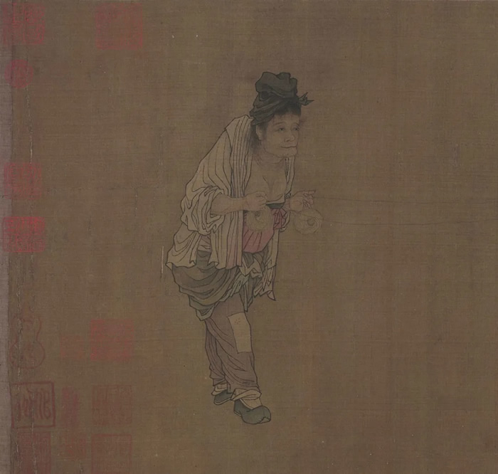 這張畫景物不多,三四個人物,主要還是一老一少兩個女子,是一件傳神的精品之作?!稉v練圖》與《紡車圖》,一個是浪漫繁華的畫面,一個是色彩暗淡、基調沉重的作品,兩張畫相對比,確實可以讓觀眾有不同的感受,是否也有像張養浩所寫的“興,百姓苦,亡,百姓苦”這樣的歷史之憂思呢?