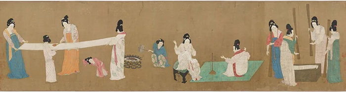 談到女性主題,本次展覽中有一幅大家耳熟能詳的作品就是《搗練圖》,但這幅圖并不是唐代張萱的原作,而是宋徽宗趙佶時期的摹本,同時這張畫與同樣是反映宋代女性勞作的《 耕織圖》并置在一起,這些作品反映了古代女性怎樣的生活?
