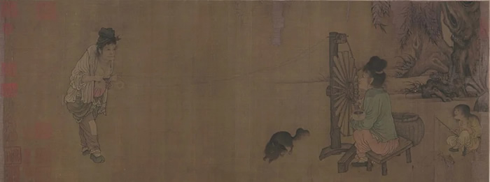 《搗練圖》和《紡車圖》相對比,兩者的差距太大了?!都徿噲D》所呈現的是現實的、沉重的、樸素的。這件作品在后人的題跋之中記錄了元代趙孟頫曾經有一首詩題給了這張畫,“春風楊柳色,麗日何清明...母子勤紡績,不羨羅綺榮”。畫面中兩位婦人配合著用紡車紡線,兩人勤勤懇懇,用雙手創造美好的生活,不羨慕那些榮華富貴,最后兩句“緬思全盛日,萬物遂所生”。在春和景明中,人們辛勤勞作,創造出美好的社會價值,這樣和諧的一個場景,使作者聯想起“憶昔開元全盛日”的盛唐時代,那時萬物生長一片欣欣向榮。