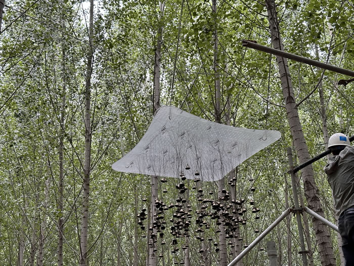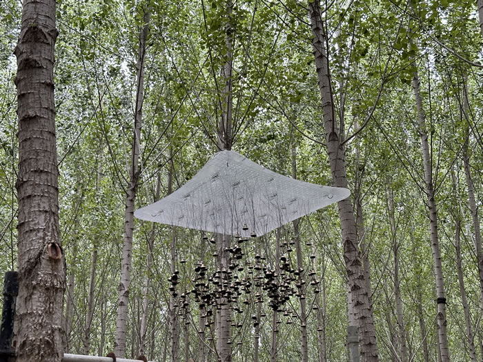 《Whisper·風鈴》是一件結合自然環境和互動裝置藝術的作品,懸掛在樹林的高處,隱秘而神秘。這組風鈴裝置旨在通過聲音與環境的交互,探索人與自然、人與藝術之間的微妙關系。將風鈴作為主要材料,不僅因為其在多種文化中象征著神秘與通靈,更因其悅耳的聲音和視覺上的獨特性。風鈴懸掛在樹林的高處,觀眾需要抬頭仰望,這種設計意圖營造一種向上探索與敬畏的氛圍。風鈴在風中輕輕作響,仿佛是大自然的竊竊私語。