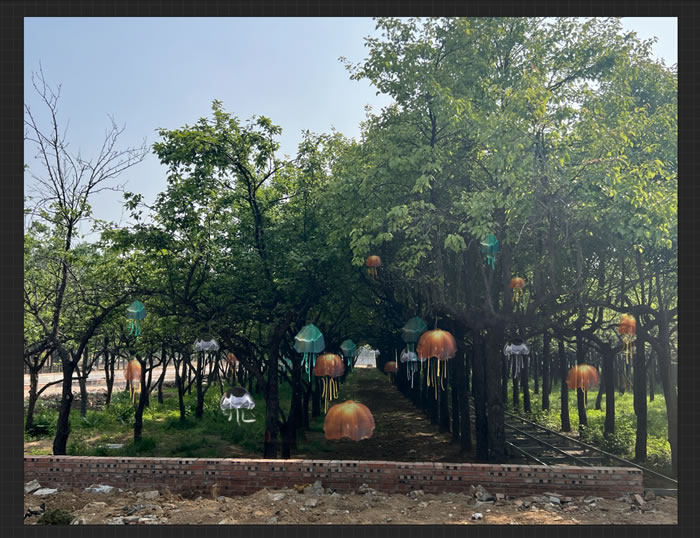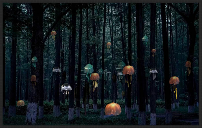 以水母作主題元素,顏色各異、大小不同的水母群漂浮于森林海洋,伴隨徐徐春風,不銹鋼管之間相互碰撞演奏出一曲清脆悅耳的大自然交響樂。作品是視覺與聽覺的共同交織,呈現出幽靜且神秘的唯美氛圍。