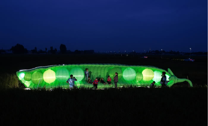 我將一片巨大的豌豆莢放置在大地上,觀眾可以在豆莢里休息,孩子可以在豆莢里嬉戲。通過這件作品,我希望給大家帶來被自然緊緊包裹的舒適感,也希望能幫助大家回溯到童年的“豆子時刻”。