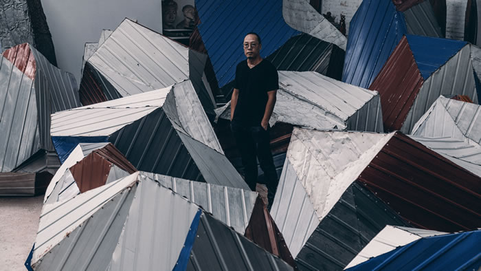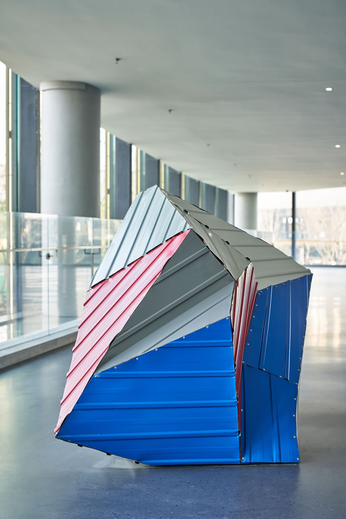 在飛速變遷的中國社會大環境下,臨時建筑材料“彩鋼板”被廣泛應用。2017年末,藝術家譚勛利用其工作室拆除下的彩鋼板,創造性地制作了第一件以其為材料的“彩鋼石”作品,命名《彩虹》。此后,藝術家以“彩鋼板”為線索調研了中國各線城市的發展與現狀,并將其延伸為一個更加龐大的《彩虹—中國計劃》,數十塊“彩鋼石”以當代藝術的姿態穿行于中國各大城市之中。