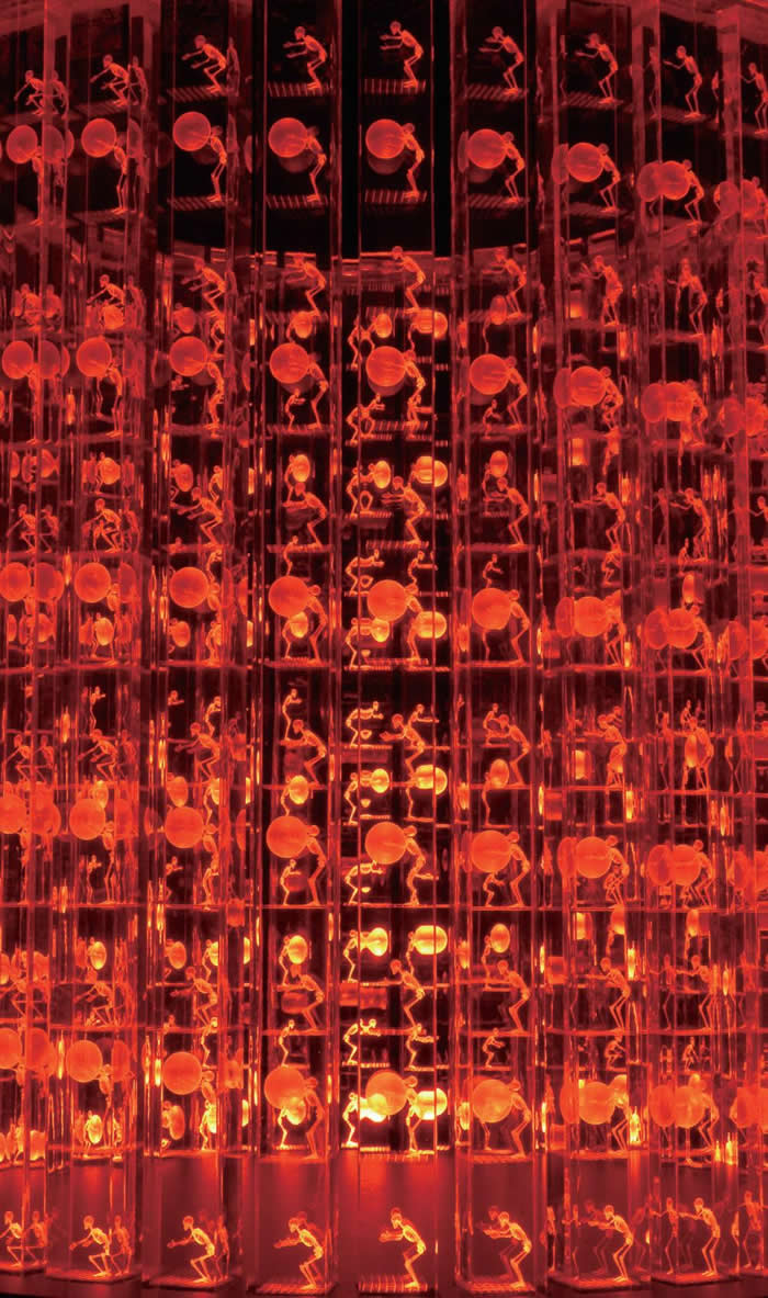 通過動態機械傳動裝把一個生命從孕育、產生到消亡的過程表現的如此直接而有力,氣泡傳遞虔誠而堅定,這不是一般對隱性世界簡單的獵奇。也許內窺世界帶來的是虛無,也許正是這虛無促發了他不甘心的勇力和真誠,把這虛無化為了一個生命的符號通過氣泡再穿越繼續著他對生命的追問之旅。作品中眾生的所有個性特點幾乎被全部隱去,而直現了作為生命的唯一符號-人型。損之又損,敢于把普通人津津樂道的個性張揚全部簡掉,讓生命共性符號能最直接呈現的力量,這需要的絕不僅僅是能力,而是悲情,- -種對生命意義本身的大情懷;在自覺和非自覺之間,傳遞出藝術家對生命意義的天問。這不是普通藝術家的個人世界的小感悟,這正是觸動觀者的內在疑情。