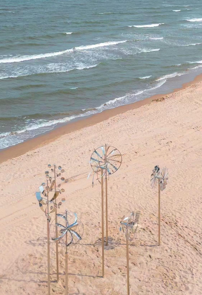 風的聚會一將抽象的概念用具象化的形式來表達,以風作媒介,在這里,風不再是無形的,裝置隨著風律動,每一陣風都被賦予不同的藝術形態,從中體會風的收與放,感知風的力與流。