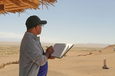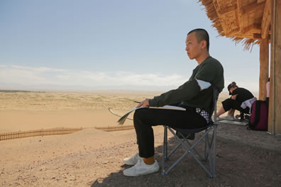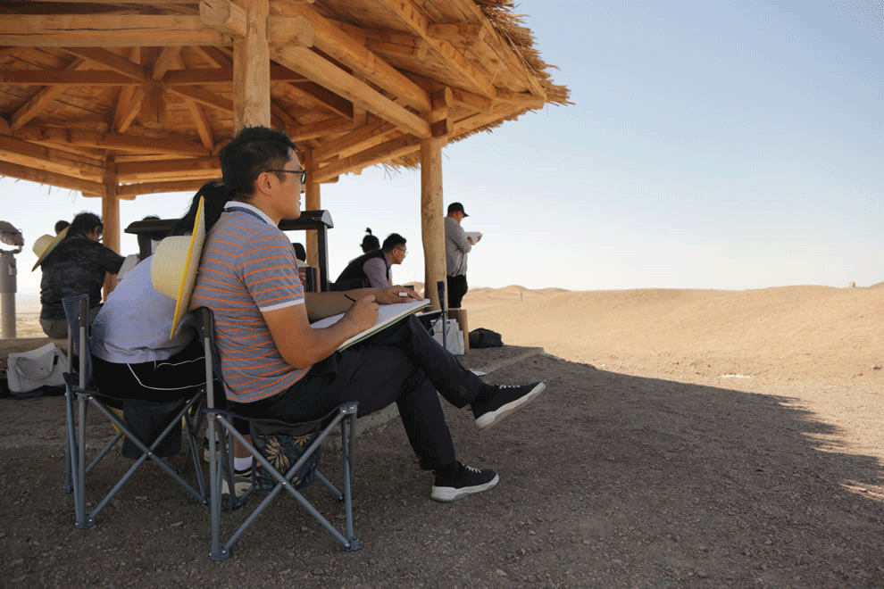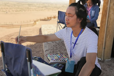 中國藝術家白建濤在鳴沙山月牙泉景區寫生