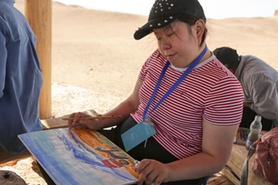 中國藝術家王玉芳在鳴沙山月牙泉景區寫生
