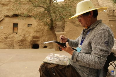 中國藝術家白建濤在西千佛洞前寫生