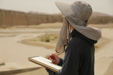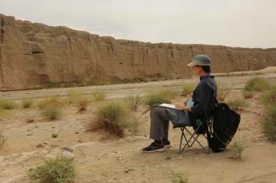 中國藝術家駱驍在黨河岸邊寫生