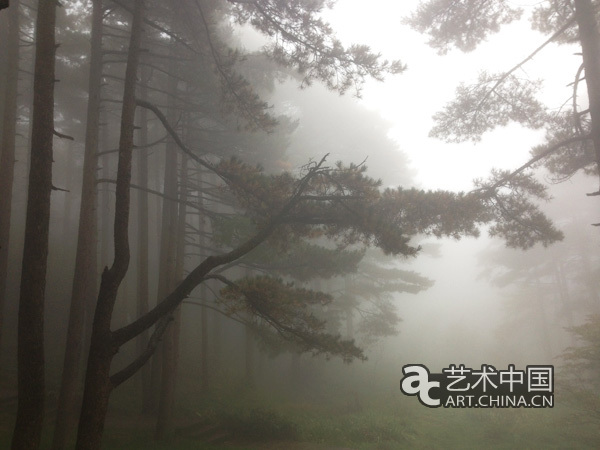 從昨晚開始黃山便霧氣彌漫,今早上已經是滿山細雨煙云,黃山一下褪去了昨日藍天下色彩斑斕的面貌,改成為黑白和光的世界,伴隨著細雨的淅淅瀝瀝,似乎找到了黃山與中國水墨畫之間的一種天然聯系。藝術家們背著行李在雨中漫步,似乎更有興致,不停地拍照留念。