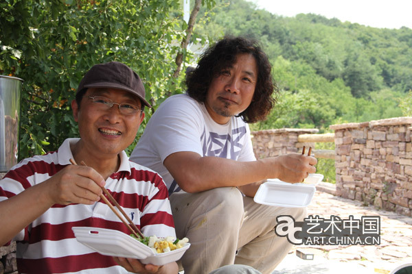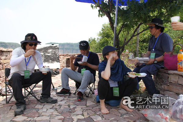 由于到達時間已接近中午,時間寶貴,所以藝術家們集體決定不下山吃飯,而是讓工作人員把最簡單的午餐帶到山上,以保證畫畫的時間。這陣勢,頗有與時間賽跑的感覺。