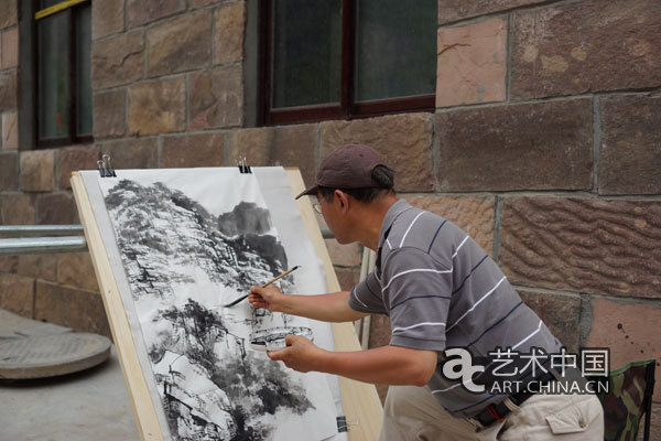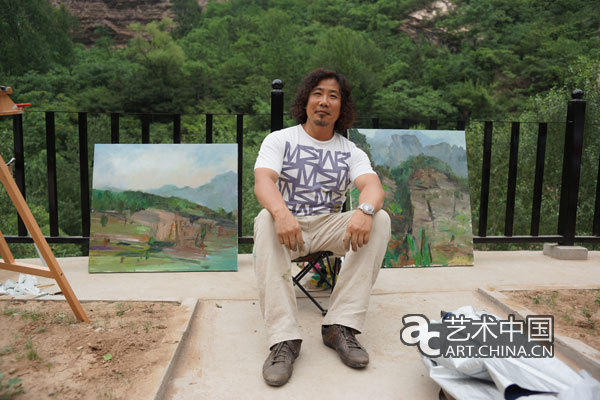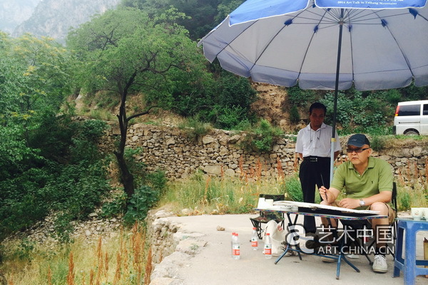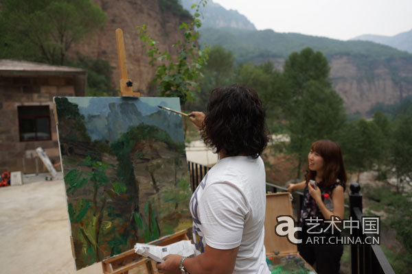 中國藝術家唐承華和吳運鴻在高家臺畫家村上游選擇了一處較低的平臺描繪眼前垂直聳立的山崖。一天兩幅油畫是唐承華每天的“基本”成果,他常說,天底下最難的事情之一就是做藝術,這是一項苦差事,但一旦動筆就再也停不下來。前幾天因為沒有適應環境和抓住太行山的整體特點,唐老師一直認為自己畫得很拘謹。但今天下午的最后一幅作品,兩個小時之內,幾乎一氣呵成,從構圖、畫面和色彩關系到整幅畫的氣質都令他十分滿意,這是他幾天來畫得最順利、最痛快的一次體會。