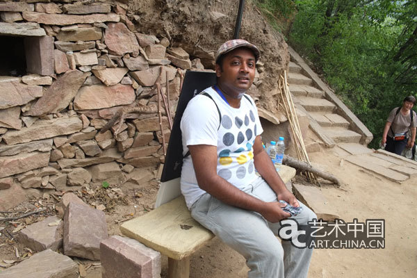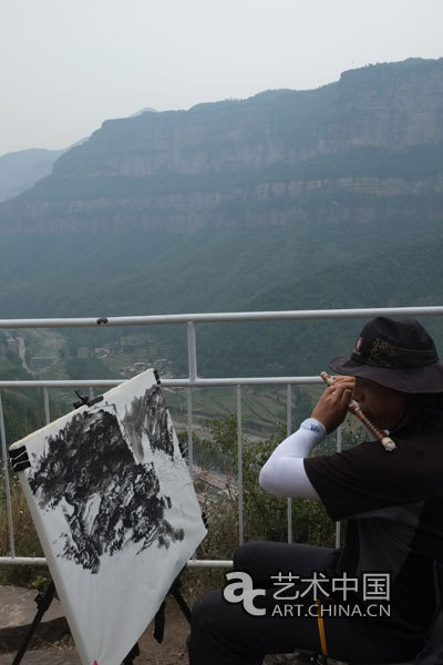 在云梯之上有一座天然平臺,韓國藝術家柳時浩在創作水墨作品時光腳踩在一塊竹席上,大有取天地之靈氣之意,畫到興起他便拿起笛子即興吹奏,清脆的笛聲與鳥鳴一起愈加顯得空曠的山林更加幽靜。法國藝術家西蒙今天的狀態好了許多,他畫了多張沿途遇到的行人,有老有少,很是生動。來王相巖旅行的游客似乎對西蒙很是好奇,紛紛圍在他的身邊看他作畫。于是這個天然平臺成為了一個臨時小畫廊,游客成了觀眾,不僅是畫作,就連藝術家自己也成為了展品。有的觀眾問:“外國藝術家為什么要來中國寫生呢?”其實這正是中外藝術家太行對話要回答的一個問題,中國的風景和文化深深的吸引著外國藝術家,使藝術家們渴望建立一種超越國界的藝術對話,通過深入中國的自然,外國藝術家們更理解中國的文化,這正是這次活動的目的所在。