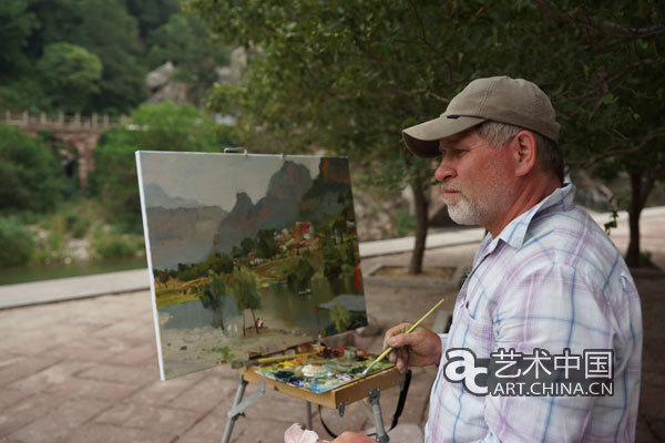 兩位俄羅斯藝術家在創作時不喜打擾,他們選擇了畫家村下游一處平臺,從平臺望過去,遠處是飄渺的群山,山上錯落分布著幾座古樸的石屋,眼前一條清澈的溪流自東向西流過,人們在溪流上漂流嬉戲,溪流邊人為搭建的棚子和隨意插著的小旗似有破壞畫面之勢……這在中國藝術家眼中絕對算不上理想的寫生地點,因為中國山水的歷史和傳統,中國藝術家慣以描繪單純的大山大水的形象。然而,在俄羅斯藝術家的眼中,他們更習慣自然的風景中有人、樹、屋、物關系的表現和表達,這是一種將藝術視為更高生活情趣和氣息反映的藝術觀。