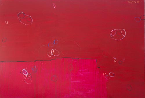 與礦工一起下到百米深的地下巷道內體驗生活?!兜V工系列》組畫顯現了譚平對造型藝術結構的準確創造能力。陽光不能普照到的地下百米巷道內,一群如石像般兀立的漢子同黑暗融為一體,唯有雙眼及頭上的礦燈發出希望的生命之光。1985至1989年,譚平作為班主任帶了版畫系85級本科班。他充分發揮了教書育人的才能并培養了一批在中國現代藝術中“興風作浪”的“時尚旗手”人物。同一時期油畫作品《童年回憶》、《大?!?、《藏區印象》系列,簡約、概括;天地、光影、人跡——在看似不經意間構成了極具營造法式的形而上空間畫面。1989-1994年在德國,譚平用丙烯顏料創作了一批既有德國表現派風格(現代藝術大師巴塞利茲是譚平留學院校的教授)又有在中央美院所練成的基礎造型痕跡作品,如《靈魂的爭斗》、《自畫像》等。而這一時期的銅版畫《無題》系列作品則有了一個本質上的飛躍;抽象形態取代了帶有具象因素的畫面,在銅版材料運用上以極具完美的技法創作出散淡的、帶著東方禪味的作品。1995-2000年,譚平在銅版畫創作上到了“膽大妄為”的無法無天之境,大塊的黑油墨“赤裸裸”地涂在銅版、鋅塊、鐵條上,隨心所欲地印在手工制作的紙張上……黑就是黑!白就是白!這黑白相生間頓現東方氣概——天地日月、陰陽乾坤,在對立統一中道法著 “極飾則素”的自然。2001-2004年,譚平的創造能力轉向了木刻版畫。放筆直取,以少勝多;刀刻斧劈、凜冽決然。由此給中國版畫界帶來了強烈的視覺沖擊波。 2004至2005年,譚平創作了一批頂天立地的架上繪畫——團狀而律動的分子細胞伴著大面積色彩在分割中構成獨立不移的象征性畫面。生命與物質在精神上融會貫通并合二為一地升華到渾渾沌沌的宇宙空間…… 這是他積三十多年繪畫功力與學力對現代藝術的詮釋!東方也好,西方也罷;譚平在東西方文化的兩極中確立著一個藝術交匯的