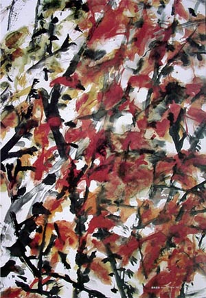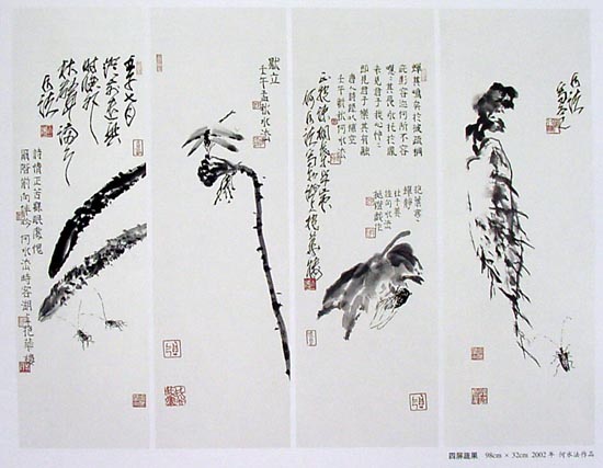 何水法:受到了影響。因為我是從1990年開始,慢慢地悟到這個問題的,應該講是1997年以后,我才慢慢地考慮一種全景式的構圖。這是我提出來的——全景式構圖。1992年全國第一屆花鳥畫展,我畫的一幅《一串紅》。慢慢我就悟到了這個問題。歷史上那些大畫家,八大、吳昌碩,包括潘天壽畫的大畫還是沒有突破。到今天為止,還是一塊大石頭上面拼盤式的。吳昌碩也是這樣的,最最根本的點還是不能突破。我在反復考慮以后,我決定把石頭全部搬下,全部拿掉。你看我后來畫的畫,我沒有石頭的。這是一個重大的突破,在思想上的很大的一個開放,假如沒有這個勇氣,我今天還是傳統,還是拎不清。我想像了一下,有石頭比較容易,一塊大的石頭能夠撐住,也有利于筆墨的豐富性,而我把小花能夠撐起,成為大的氣概,在筆墨要求上更高。