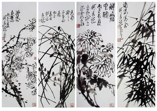 何水法:啊唷,我本來要畫一張大幅工筆櫻花的,因為沒有精力畫。我這個硬功夫呀,我閉起眼睛來可以隨意揮灑。因為我的腦海里都是花。畫感覺。所以我近年來最成功的一點,就是傳統筆墨來畫生活的感受,又有現代的構成意識,我都到位了,筆墨是傳統的,構成是現代的。生活是有感受的。