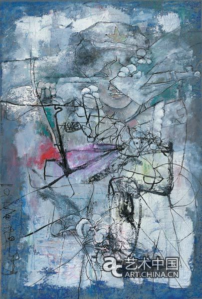 石虎是中西融合派中的弄潮兒。在路線上,他是和林風眠、關良等一脈相承的。不同于他們的是,他面對的是西方現代思潮更為劇烈的變動,而且,西方現代思潮的積極成果也已經更清晰地顯示出來。倘若前輩藝術家們僅僅借鑒早期現代流派的話,那么石虎這一代人已經對抽象主義、抽象表現主義和超現實主義很感興趣和很迷戀了。石虎并沒有傍依某一個派別,他廣覽博取,凡是認為適合自己表現需要的,他都大膽地拿來,為我所用。但是在借鑒西方繪畫觀念和實踐的同時,石虎始終堅持文人畫的傳統。何謂傳統文人畫的真諦?用陳師曾的話來說,畫“是性靈者也”,文人畫是“發揮其性靈與感想而已”。文人畫首重精神,不貴形式。文人畫重畫家的人格、修養,脫離一切塵垢之念。當然,所謂“文人”這個概念也有時代的內容,現代的文人不同于封建文人士大夫,應該是有現代的意識。但文人的基本要求——表現性靈與感想,至今仍然適用的。石虎不是用觀念作畫,他深深懂得“形象大于思維,直覺大于理性,人性大于學養”。他作畫主要憑直覺,憑靈性,憑借生命的沖動和生命意識。這并不是說石虎作畫前不思考,不用思想。反之,他對歷史、社會、人生、藝術,都有很深、很廣闊的思索?!缎U夢》一文就充分說明這一點??墒?,對石虎來說,他把實踐放在第一位。一切觀念,一切思考,在面對畫紙、畫布時,都被暫時忘卻,他尊重的是自己的感覺功能,他似乎胸有成竹,又全然胸無成竹,全憑自己的感覺、感性和內心的需要作畫。他選取定了特有的媒材手段、他又隨機應變,任意應變,任意地使用當時畫面需要的媒材和手段,甚至“不擇手段”,以馳騁自己的想象力,體現自己的創作欲求。這時,他已無暇考慮繪畫的中西。其實,藝術體系有中西之分,可中西藝術是互相溝通的。藝術語言最重要的是體現人的感情,而不論中國或外國,好的藝術品都是表現強烈的感情的,石虎把個性放在第一位。其他一切,對他來說,似乎都是次要的。大概正是這個原因,許多外國人也像中國人那樣欣賞石虎的畫。外國人之所以欣賞,是因為他們懂得石虎的藝術語言,那是和西畫可以溝通的語言:他們之所以欣賞,大概還因為他們通過石虎的畫,可以增加對中國文人畫的認識和理解。