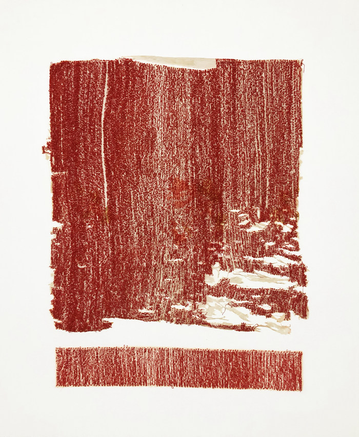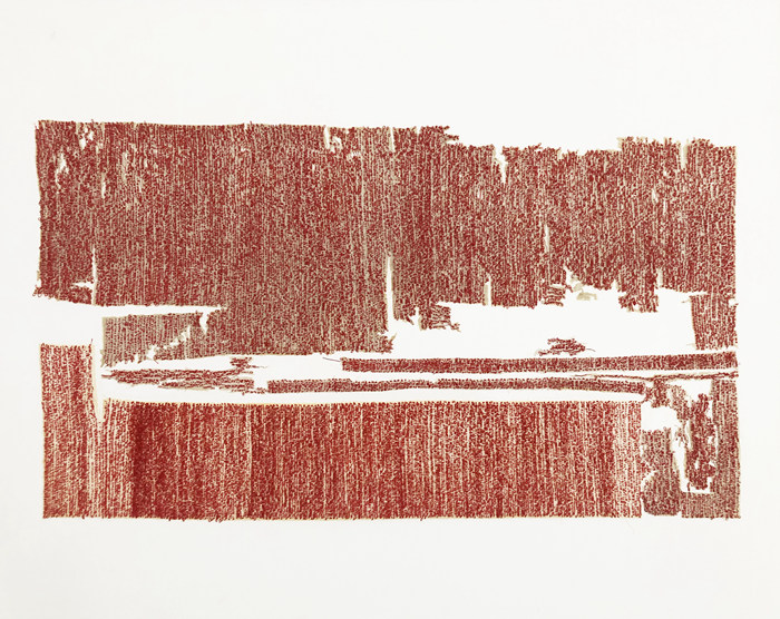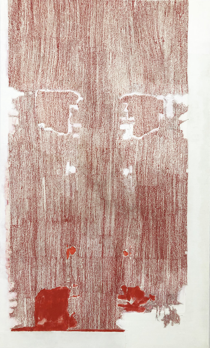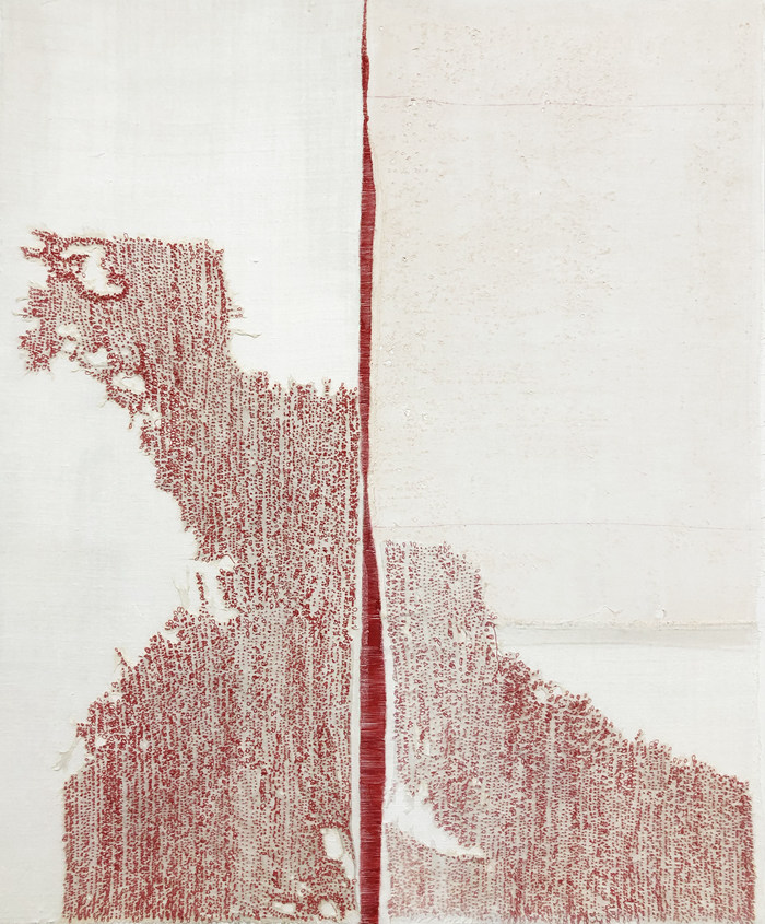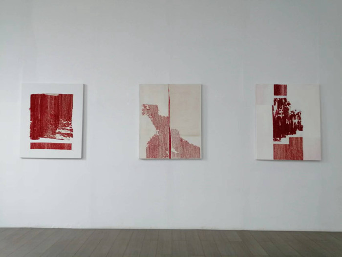 在《無序點云》系列作品中,我依然使用熟悉的創作材料“布和線”,不同以往的是,布的質感隱藏于線之后,棉線承載著大面積的紅色,單純卻顯得有力量,象征著救贖和潔凈。我想只有最單純的色彩才能喚起最強烈的心靈感受,回到繪畫本身,用純粹的紅色去探索繪畫的潛力和更多的可能性。