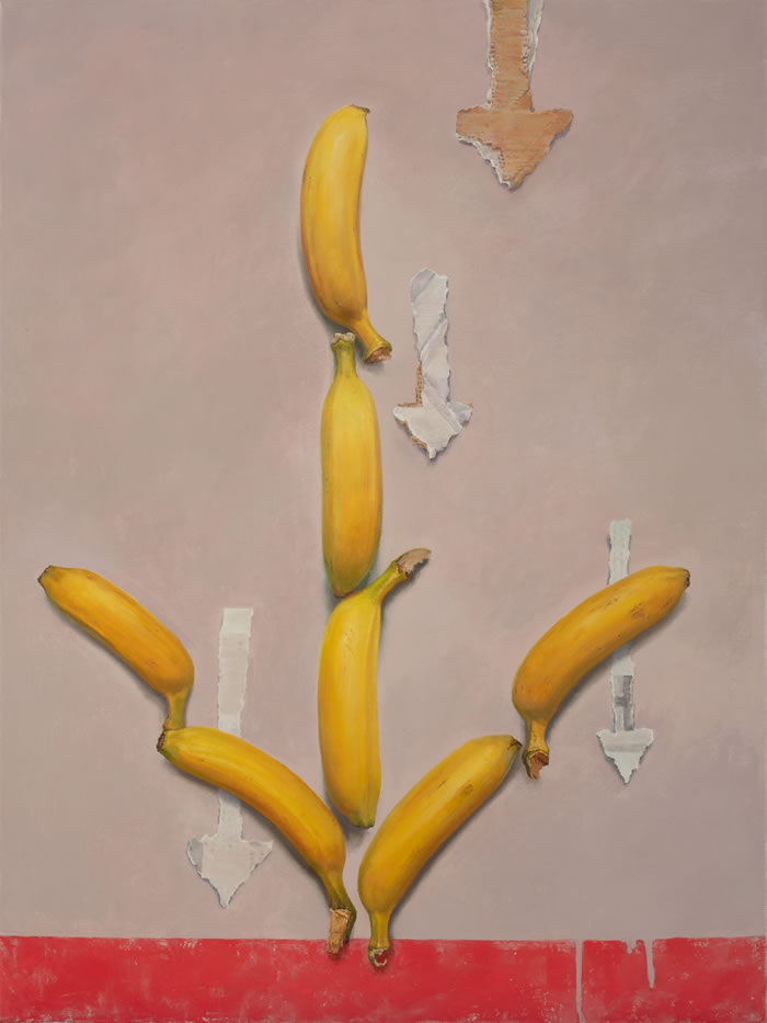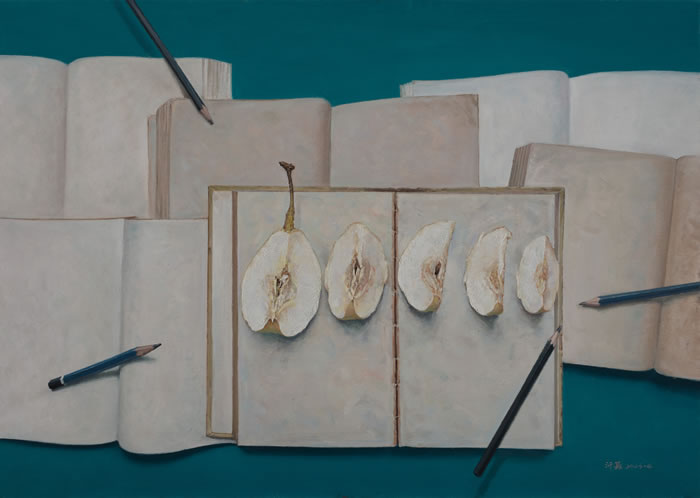 近期的作品用蔬果與書籍為題材,果腹的蔬菜水果與傳播精神文化的書籍,代表了兩個層面?!靶味险咧^之道,形而下者謂之器”。試圖用繪畫的方式把道與器之間的關聯,用繪畫的形式進行的詮釋。人生有不同的年齡階段,也有不同的認知階段,還有不同的生活境遇。接觸層面有所不同,不同階段對道與器的認識和體悟自是不同。這里面有很多話可說。老子說道可道非常道,繪畫的圖式剛好可以去提示或暗喻某些“道”的智慧。