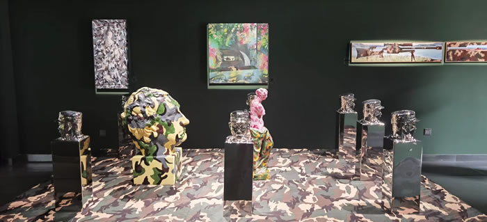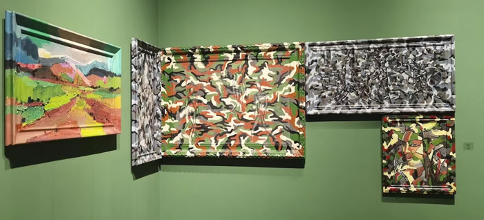 Xing's artworks address the integration of culture and the military- of guns and roses, of landscapes that are richly impressionistic and others that are totally disguised by camouflage pattern. Historic Western cultural icons are juxtaposed, integrated, with symbols of today’s Chinese power. Xing combines contrasting, even contradictory images with confidence and ease showing a possible new reality. Individuals, buildings, even landscapes fit into an integrated vision of a positive future.
