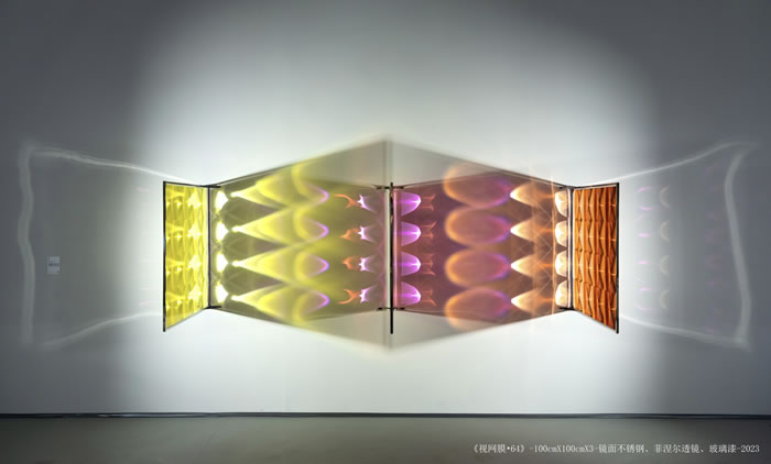 《視網膜·64》100x100cmx3 鏡面不銹鋼、菲涅爾透境、玻璃漆 2023年