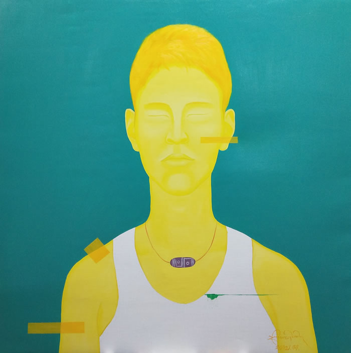 一是橫向坐標軸,即放在當代青年藝術家中。在當代的青年藝術家中,赤列德慶的作品具有極高的辨識度。 無論是從用色上的高原色彩,還是在構圖及藝術表達上的既西藏又國際、既傳統又當代的繪畫語言,都有著藝術家獨特的藝術語言?!凹任鞑亍?,是指他的作品中,雖沒有明確指出地域,但明艷的色彩, 喜馬拉雅的符號語言,無不讓人感覺到畫中的文化聯結。 “又國際”,是指在繪畫語言上, 赤列德慶的早期人像(《自畫像》系列、《相》系列等)和近期的抽象人像(《非我像》系列),與國際當代繪畫語言一脈相通。
