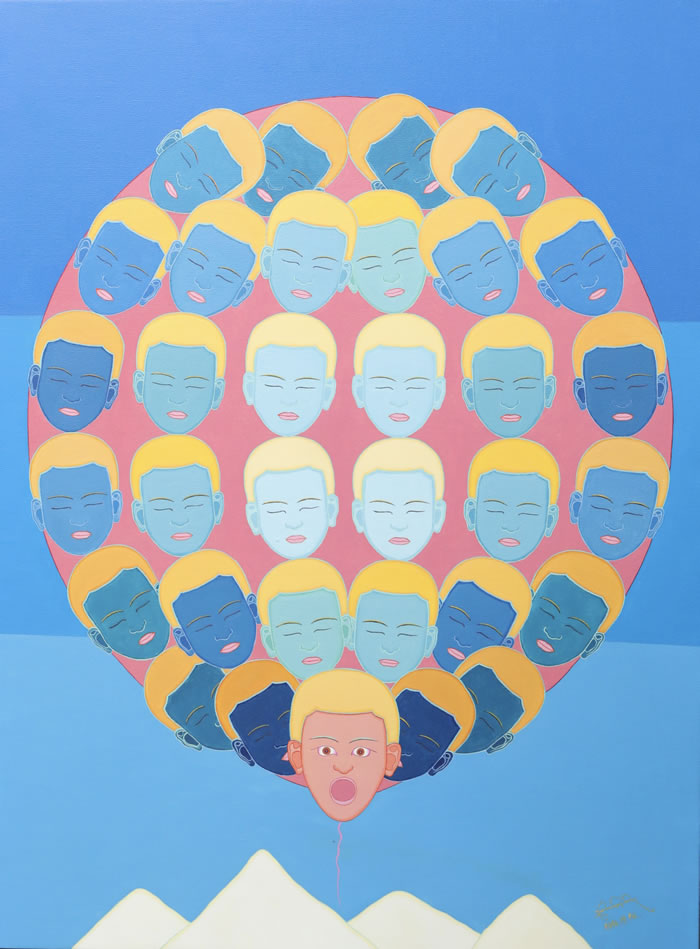 《云》系列是赤列德慶的早期作品,始于赤列德慶研究生期間,也是他從寫實油畫轉向個人風格的第一個創作系列。在這一系列中, 我們沒有看到傳統的佛教題材,而是藝術家以自身形象來塑造畫面中的人物。云,在藏文化中通常含有無常的寓意。藝術家將自我形象塑造為畫面中的人物,采用對稱性的構圖,鮮明的高原色彩,構造出具有神秘感的畫面語言。 該系列展現了藝術家的自我迷茫與人生思考, 掙扎與矛盾中卻蘊含希望。