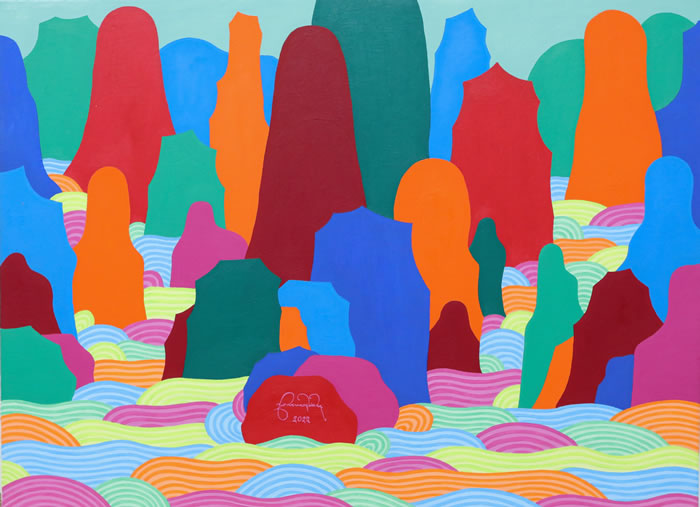 《山水》系列是一種藏文化語境下的對神圣山水的表達,畫面中表達了藝術家對于山水及自然的敬畏。在傳統西藏文化中,山具有勇敢、踏實、頂天立地的象征意義,水流波紋象征著純潔與智慧,以及生命的流動與無常。