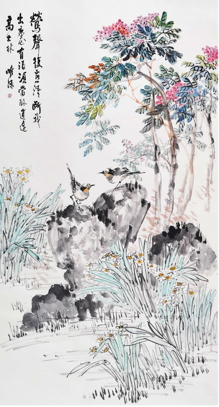 名稱:鶯聲燕語 作者:宋唯源 材質:紙本 尺寸:68×136cm 年代:2019