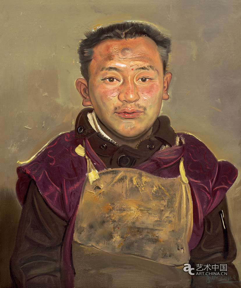 這是令我感動的一次寫生。碰見他是在西藏拉薩大昭寺。一個穿著破爛的年輕喇嘛正在圍繞著大昭寺一圈又一圈地磕長頭,他腦門觸地磕出了灰色的大包。我為這種虔誠的信仰所震撼。陪同我的藏族畫家朋友才讓隨即掏出些零錢給他,他坦然的收進衣袋。我請才讓問他可不可以請他畫肖像,并說明報酬,他欣然答應。等繼續完他一天要完成的長頭后跟我們回賓館。當他走到賓館大門前向門衛請示是否可以進去時我突然熱淚盈眶。他們以最謙卑的身軀托舉著最高貴的靈魂。