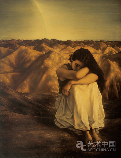 我舉出他的三幅早期作品的畫題為例,試著闡明他的藝術特質。一幅是《彩虹悄然當空》(1993),一幅是《難以保存的記憶》(1995),一幅是《永恒的樂章》(1996)?!峨y以保存的記憶》描繪新生嬰兒躺在小床上觀看飄浮的塑料玩具,但棕色調的作品卻給人一個荒涼的星球感?!队篮愕臉氛隆放c《彩虹悄然當空》描繪的都是知識女性,但人物的背景空間卻是不明確的,她們專注于自我內心,神態凝重,如雕塑一樣矗立在景觀之中。彩虹是美麗而短暫的,記憶是復雜而瞬逝的,樂章雖然永恒,但需要一代代人的重新演奏。換言之,龐茂琨的早期作品,具有意大利文藝復興早期波提切利的作品那種淡淡的憂郁,充滿生命對于美好的懷想,記憶對于時間的挽留,短暫人生對于永恒價值的追求。這樣的藝術氣質,貫穿了龐茂琨不同時期的創作,使得其藝術雖然具有階段性的風格變化,但內在的特質卻具有持續的穩定。換言之,龐茂琨的藝術是我們這個時代的一種視覺記憶,他努力將生活的碎片連綴為精神的整體,將短暫的印象轉換為永恒的畫面,將喧囂的浮世呈現為冷靜的圖像。